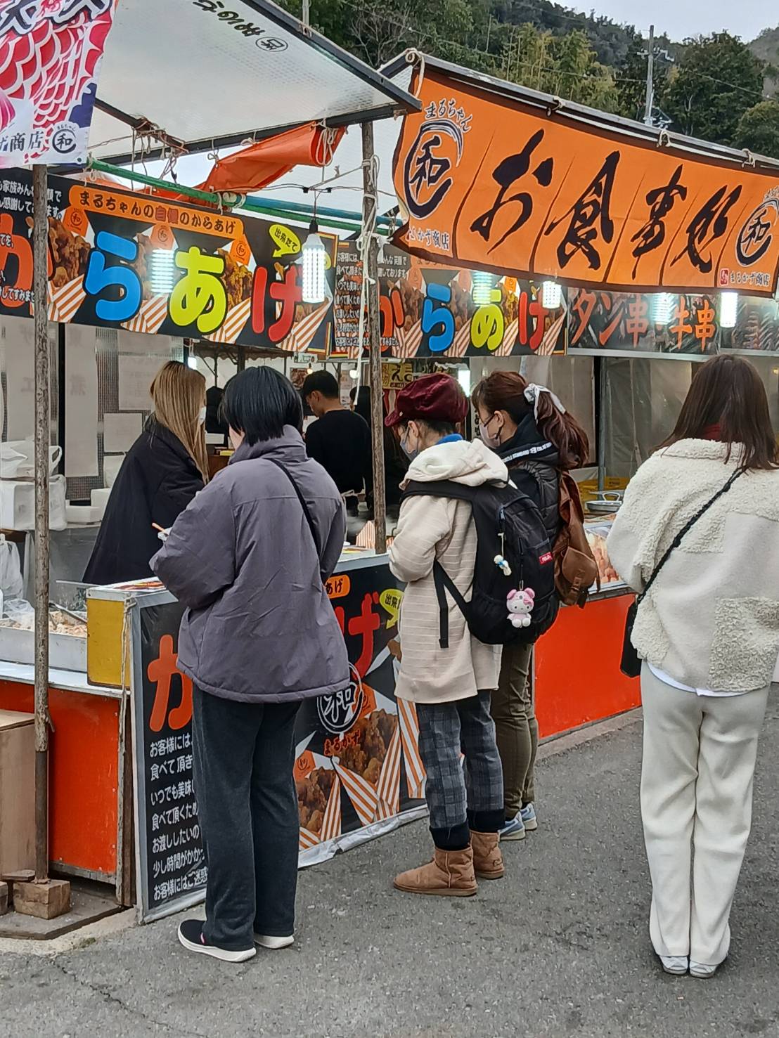 参道の露店で有名なかしわ餅をお土産に購入したり、からあげなど食べ歩きしながら楽しみました。